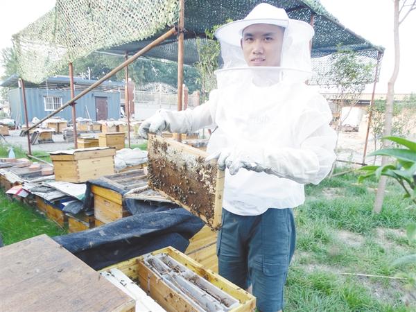 6月24日,沈丘縣付井鎮(zhèn)九里村的退伍軍人蘇尚方,正小心翼翼地從蜂箱里取出蜂蜜板,準(zhǔn)備采收蜂蜜?!拔茵B(yǎng)了120多箱蜜蜂,年產(chǎn)蜂蜜3000多公斤,經(jīng)濟(jì)收入十分可觀?!碧K尚方說,他專門成立了蘇家養(yǎng)蜂專業(yè)合作社,帶領(lǐng)當(dāng)?shù)刎毨粢黄鹈撠氈赂?。謝辛凌 攝