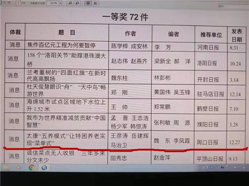 河南新聞獎是河南省新聞界最高獎。日前,經過初評、復評、定評、公示等一系列環(huán)節(jié)后,《周口日報》二版頭題刊發(fā)的《太康“五養(yǎng)模式”讓特困養(yǎng)老實現(xiàn)“菜單式”》(作者:王彥濤 岳建輝 馬治衛(wèi) 編輯:魏東 李鳳霞)喜獲河南新聞獎一等獎,成為周口市唯一獲得一等獎的新聞作品。同時,《太康“五養(yǎng)模式”讓特困養(yǎng)老實現(xiàn)“菜單式”》還榮獲了中國地市報新聞獎二等獎,可謂“雙喜臨門”。