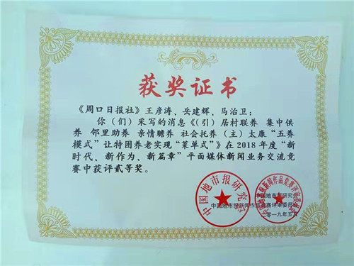 中國地市報新聞獎評選活動由中國地市報研究會主辦,每年舉辦一次,在全國有著廣泛的影響,此項新聞獎評選活動涉及全國幾乎所有地市黨報,不僅是展示地市黨報形象的重要舞臺,也是衡量地市黨報辦報水平的重要標志,同時也是以新聞的形式展示各地亮點工作的重要。《太康“五養(yǎng)模式”讓特困養(yǎng)老實現(xiàn)“菜單式”》稿件在此項新聞獎評選中,同樣表現(xiàn)不凡,最終榮獲中國地市報新聞獎二等獎。