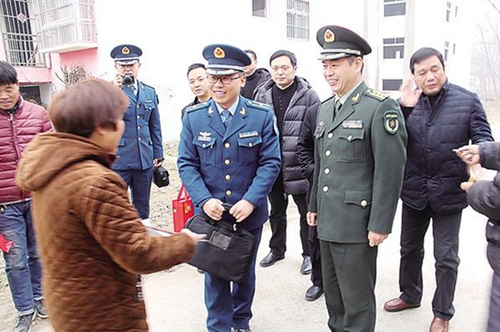 項(xiàng)城市人武部政委汪燦輝為立功受獎戰(zhàn)士家庭送喜報(bào)