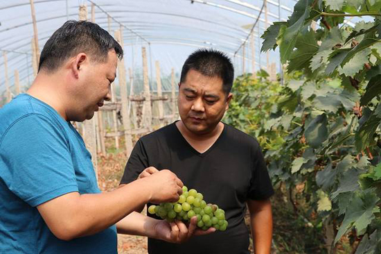 “2016年我們財政局出資13萬元,幫村民建了這個15畝的葡萄園,由30戶貧困戶做股東,孫東獻(xiàn)懂葡萄種植技術(shù)由孫東獻(xiàn)來管理,每年帶動近十戶貧困戶來葡萄園打工,每戶凈收入4000多元,加上出售葡萄的分紅,每戶凈收入提高到近5000元。并且這是個可持續(xù)發(fā)展的項目?!瘪v村書記侯俊昌介紹說。