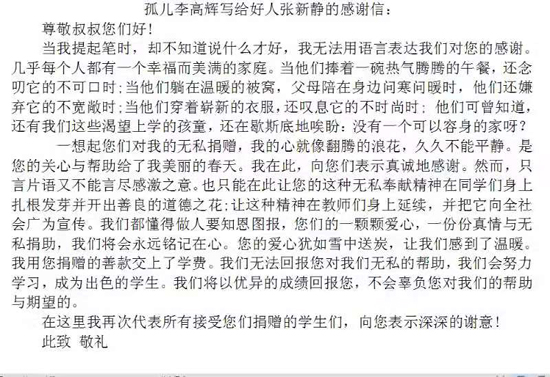 為表示對(duì)張新靜等人大代表的感謝,隨后,李高輝給張新靜寫了一封感謝信。信中,他表示,自己一定不辜負(fù)大家的期望,以后會(huì)更加努力學(xué)習(xí),回饋社會(huì),回報(bào)大家。“他是一個(gè)懂得感恩的孩子,讀了他的來信,我感到很欣慰?!睆埿蚂o說。