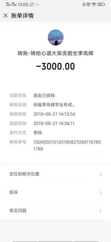 “今后,在學(xué)習(xí)和生活上無論遇到什么困難,只管給我們說,我們會(huì)隨時(shí)幫助你解決?!睆埿蚂o在與李高輝聊天中再三叮囑李高輝說。隨后,他通過微信給李高輝轉(zhuǎn)來3000元學(xué)費(fèi)。