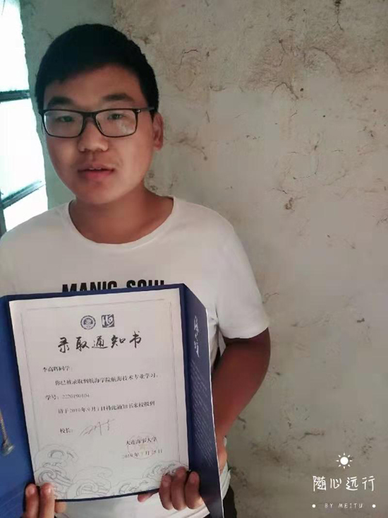 據(jù)了解,李高輝是一個(gè)命苦的孩子,很小的時(shí)候父親因病去世,母親改嫁,無奈,他只好跟隨年邁多病的爺爺奶奶一起生活,家庭十分拮據(jù)。俗話說,窮人的孩子早當(dāng)家。李高輝從小學(xué)就知道勤奮學(xué)習(xí),養(yǎng)成了不懼困難,愛幫助別人的性格,深受師生喜愛。經(jīng)過10多年努力拼搏,2019年高考,他以優(yōu)異的成績(jī)被大連海事大學(xué)航空學(xué)院錄取。