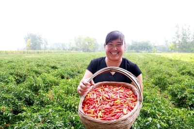 在朱樓行政村,朱高杰、王麗夫妻倆正帶領(lǐng)20多名采摘工人在辣椒田里采摘艷紅、泡椒兩個(gè)品種,地頭停放著盛滿辣椒的三輪車和五六個(gè)蛇皮袋,火紅的辣椒映襯著小兩口臉上燦爛的笑容:“大豐收呀,這塊地是泡椒,還沒有出地頭,就劃3.8元一斤了,走向市場至少五六元錢。咱吃的泡椒鳳爪、泡椒罐頭,都是這做的。像那塊地的艷紅,就像它的名字一樣又紅又鮮艷,出地頭就得七八塊,賣到市場上都10多元一斤,主要賣到四川、湖北等地,這是火鍋底料、炒菜的必備品,這是個(gè)炒出來有香味的辣椒品種。”王麗能說會(huì)道,而且在她的帶動(dòng)下,全鄉(xiāng)許多親朋好友都在種植辣椒。像王麗一樣,汲水鄉(xiāng)種植辣椒面積突破了1萬畝,整個(gè)鄲城縣種植辣椒突破5萬畝。