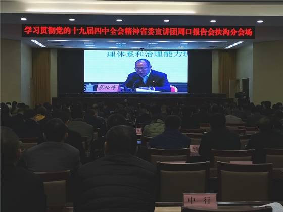 根據(jù)省委統(tǒng)一部署,11月27日,學(xué)習(xí)貫徹黨的十九屆四中全會精神省委宣講團報告會在周口市舉行,扶溝縣四個班子領(lǐng)導(dǎo)和縣直各單位負責人在扶溝分會場聆聽宣講報告。