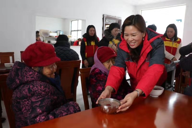 “開飯嘍!”中午時分,志愿者們將老人一一攙扶到餐廳坐下,隨后將一碗碗香氣四溢、且冒著熱氣的八寶粥端到老人跟前。“香,真香!”80歲的黃柏功老人舀了一勺八寶粥放到嘴里品了品笑著說。吃著八寶粥,老人想起了以前的艱苦生活,他禁不住激動地哭了起來:“以前,吃了上頓沒下頓,想吃一塊白面饃,都得等到過年。可現(xiàn)在,天天不斷肉,生活越來越好。這都是共產(chǎn)黨給咱的福啊?!?/p>