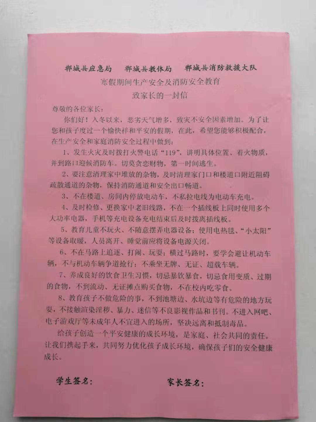 《寒假期間生產(chǎn)安全和消防安全教育致家長(zhǎng)的一封信》包括正確報(bào)119火警、電動(dòng)車充電、電熱毯使用、保持疏散通道暢通等消防安全知識(shí)以及交通安全、食品安全、網(wǎng)絡(luò)安全等,內(nèi)容豐富,有很強(qiáng)的針對(duì)性。鄲城縣委常委、常務(wù)副縣長(zhǎng)王智華高度重視《一封信》的印制發(fā)放工作,專門召開(kāi)會(huì)議要求縣應(yīng)急局、縣教體局、縣消防救援大隊(duì)各司其職、密切配合,縣消防救援大隊(duì)牽頭,挑選貼近生活、身邊常見(jiàn)的安全及消防常識(shí),以簡(jiǎn)潔實(shí)用、通俗易懂的語(yǔ)言,印制《一封信》內(nèi)容;縣教體局要迅速部署,確保在放假之前,把《一封信》發(fā)放到每名學(xué)生手中。為確保取得實(shí)效,縣教體局、縣消防救援大隊(duì)還聯(lián)合發(fā)文,要求《一封信》必須由家長(zhǎng)和學(xué)生共同完成學(xué)習(xí),學(xué)習(xí)完畢后家長(zhǎng)和學(xué)生還要共同簽名確認(rèn),假期結(jié)束后由學(xué)校統(tǒng)一收回報(bào)教體局存檔。