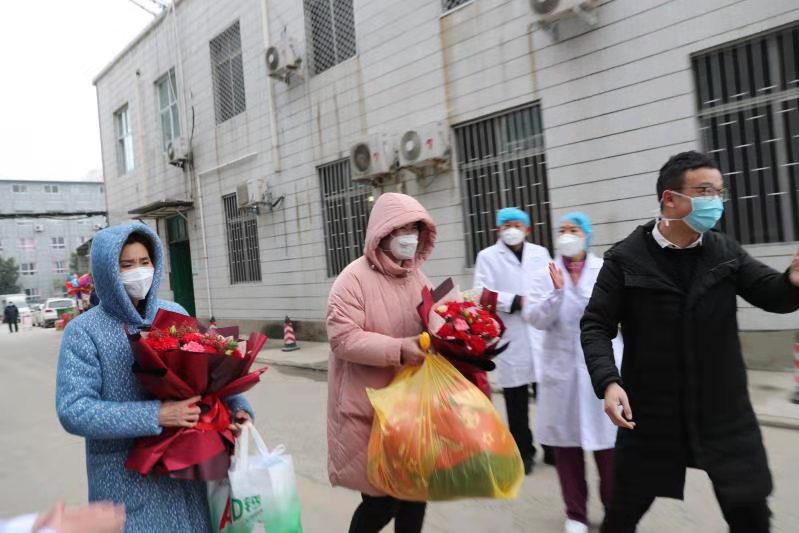 當(dāng)日下午3時(shí),朱某某、陳某某在醫(yī)護(hù)人員的陪伴下從病房里走出,太康縣人民醫(yī)院院長(zhǎng)聶方華帶領(lǐng)院領(lǐng)導(dǎo)班子與醫(yī)護(hù)人員一道給兩名出院的患者舉行了簡(jiǎn)單而熱烈的祝賀儀式?!案兄x偉大的祖國(guó),感謝偉大的黨,感謝太康縣委、縣政府,感謝醫(yī)院的醫(yī)護(hù)人員!”患者陳某某出院時(shí),“感謝”二字一直掛在嘴邊。為了表達(dá)謝意,朱某某、陳某某出院前專門委托家人給醫(yī)護(hù)人員送來(lái)了鮮花。
