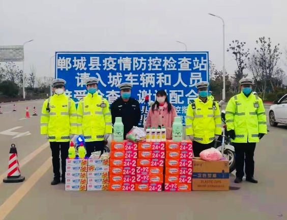 2月6日下午,周口市格林生活廣場總經(jīng)理于云帶著消毒液、噴壺、火腿腸、方便面等慰問物資,來到鄲城縣文昌大道與迎賓大道交叉口疫情防控檢查卡點,看望慰問值勤的公安民警。