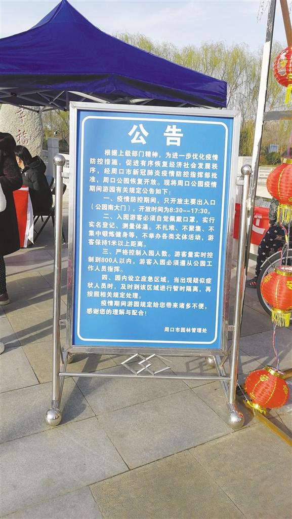 當(dāng)日上午10時許,記者在周口公園看到,在南門入口處的醒目位置,擺放著一個公告牌,寫有入園須知,上面顯示疫情防控期間的開園時間為8:30~17:30,不少游客駐足觀看。入口處,周口市園林管理處疫情防控宣傳臺前的工作人員正忙碌著。游客需間隔1米距離排隊,經(jīng)測量體溫、登記身份證號、雙手噴灑酒精后方可進園。雖然入園程序有點繁瑣,但是游客都非常配合。