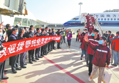 “英雄,英雄,你們最棒!”“白衣天使,歡迎回家!”3月19日16點(diǎn)左右,鄭州國際機(jī)場(chǎng)269停機(jī)坪響起熱烈的歡迎聲音,支援湖北的鄭州大學(xué)第一附屬醫(yī)院國家緊急醫(yī)學(xué)救援隊(duì)隊(duì)員和鄭州市直醫(yī)院的醫(yī)療隊(duì)隊(duì)員一起乘坐南航包機(jī)平安到家了。在接下來的一個(gè)小時(shí)里,又有兩架搭載支援湖北醫(yī)療隊(duì)隊(duì)員的南航包機(jī)相繼降落。至此,當(dāng)天共有453名河南抗疫勇士從武漢返家。
