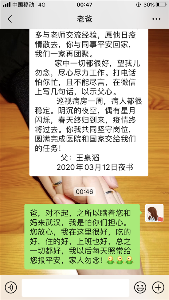 3月13日0時(shí)許交完班的王孟杰看到這封家書后,淚如雨下。平復(fù)心情后的她給父親回了這么一段話:“爸,對(duì)不起,之所以瞞著您和媽來(lái)武漢,是怕你們擔(dān)心。您放心,我在這里很好,吃得好、住得好,上班也好,總之一切都好。我以后每天照常給您報(bào)平安,家人勿念?!?/p>