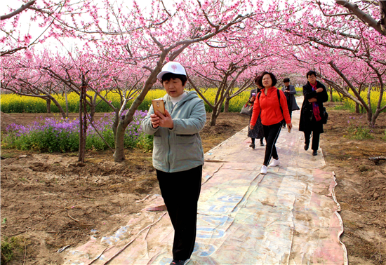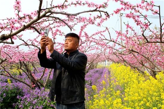 “老鐵們,今年桃花節(jié),因受疫情影響,是網(wǎng)上舉辦的,喜歡看黃橋桃花的網(wǎng)友,不要遺憾,我是您的忠實(shí)老鐵,每天會(huì)準(zhǔn)時(shí)給您分享桃花節(jié)的美景圖片及視頻,讓您足不出戶觀賞到萬畝桃園桃花盛開的美景?!?月22日,在西華縣潁河灣生態(tài)采摘園,網(wǎng)紅“西華桃子哥”和合盛正在拍攝桃園美景,一邊通過抖音、快手、微信群向網(wǎng)友拍攝上傳桃花盛開的視頻、圖片等美景,一邊樂此不疲地口中念念有詞道。