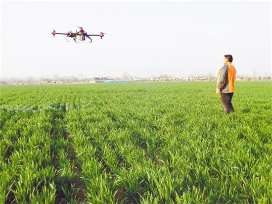 3月24日,在沈丘縣周營鎮(zhèn)平安農(nóng)業(yè)種植合作社訂單優(yōu)質(zhì)小麥種植基地,身穿“黃馬甲”的小麥飛防技術(shù)員正操作無人機(jī),進(jìn)行“一噴多防”病蟲害防治,為夏糧豐產(chǎn)豐收奠定基礎(chǔ)。謝辛凌 攝