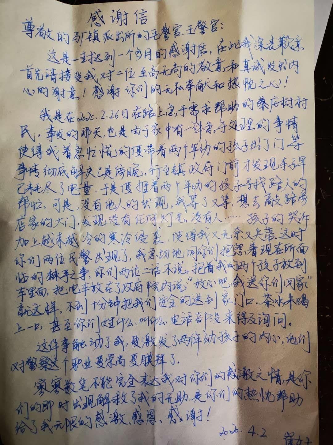 從聊天中得知,該女士姓崔,家距離衛(wèi)生院較遠(yuǎn)而且家里有兩名老人,她的丈夫又在外地??赐瓴?,派出所所長(zhǎng)毛衛(wèi)庚指示巡警民警把崔女士和孩子們安全護(hù)送到家。后來(lái),崔女士家人多次聯(lián)系毛衛(wèi)庚說(shuō)要表示感謝,都被民警們謝絕。