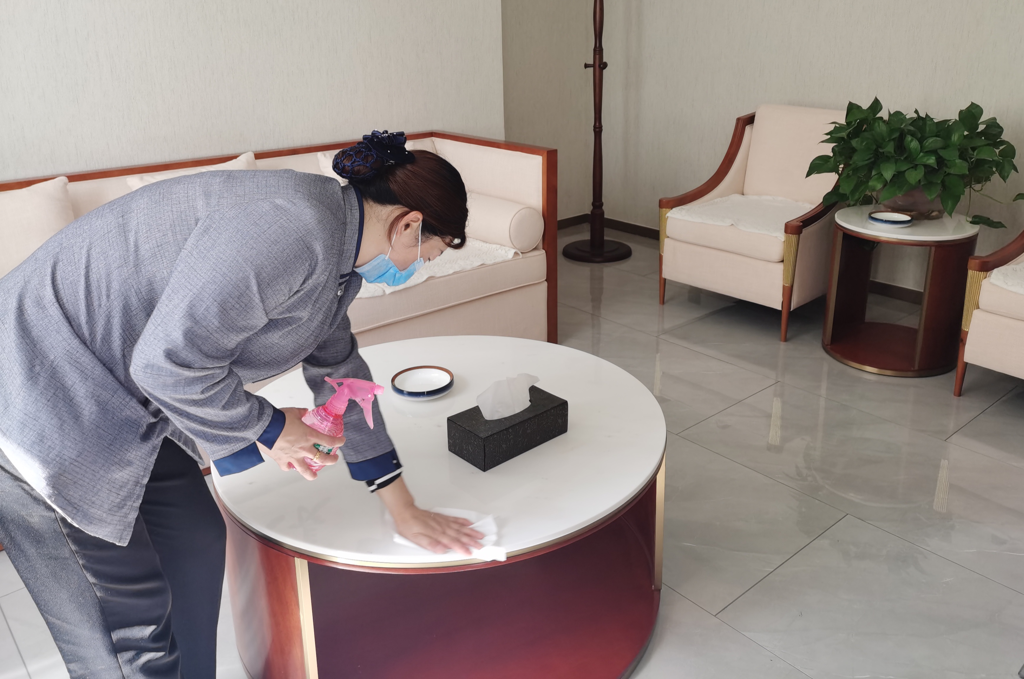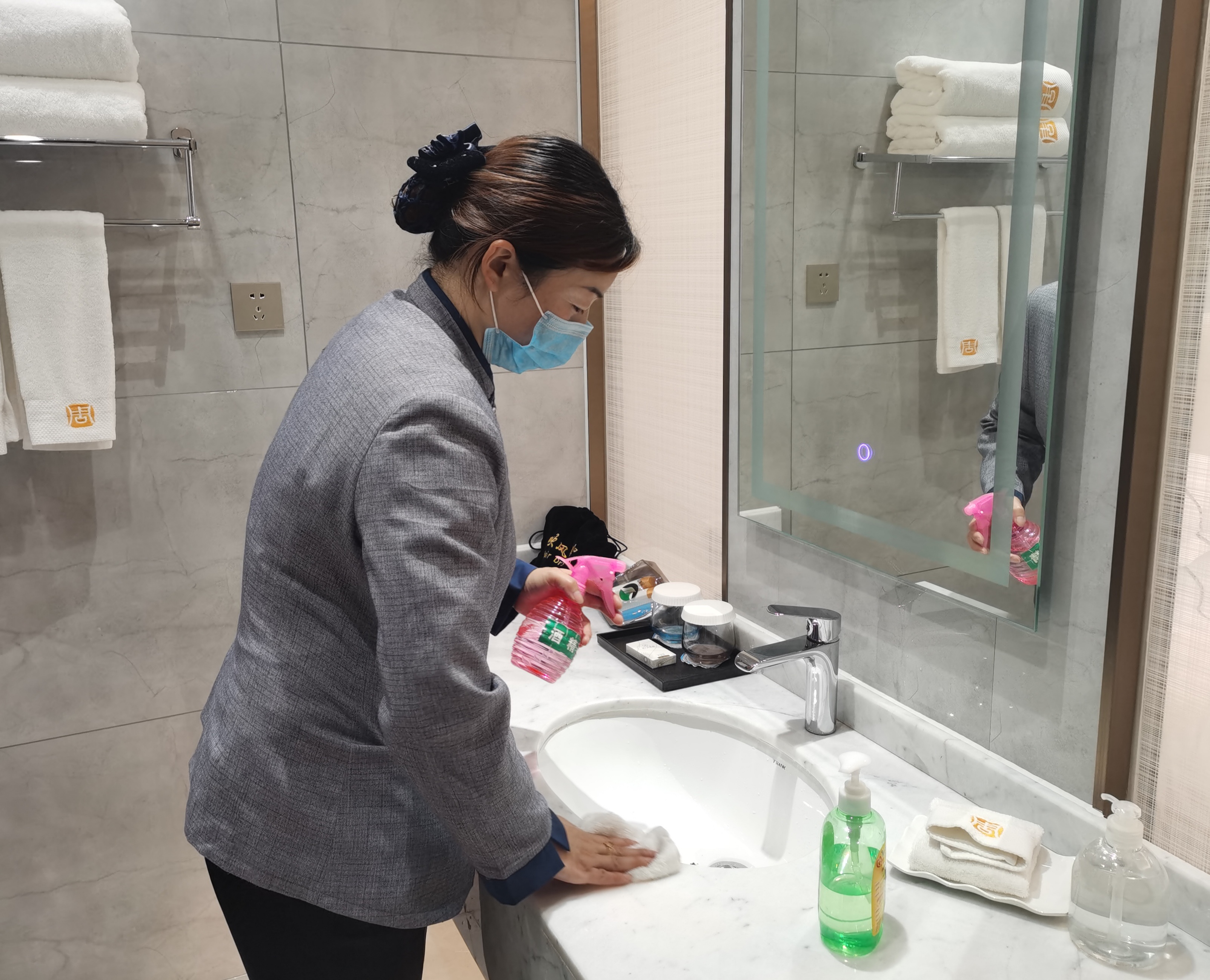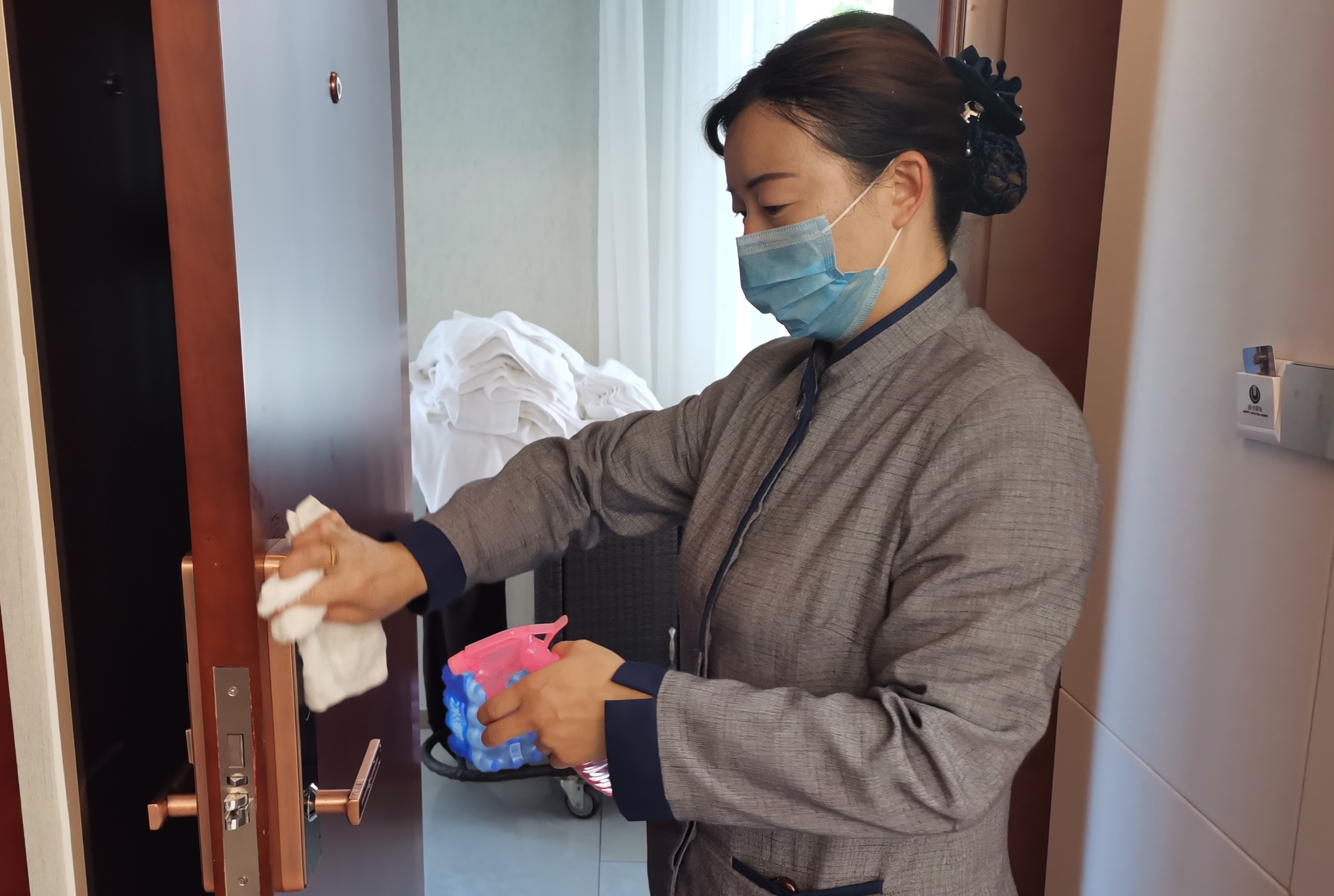 5月10日,記者在“兩會”駐地酒店看到,酒店工作人員不時對客房和公共場所、會議室進行消毒、擦拭。受疫情影響,“兩會”駐地酒店工作人員認(rèn)真和精心準(zhǔn)備,加強了對代表、委員駐地消殺防疫,還貼心地放置了一次性電梯按鍵專用紙、酒精等物品。