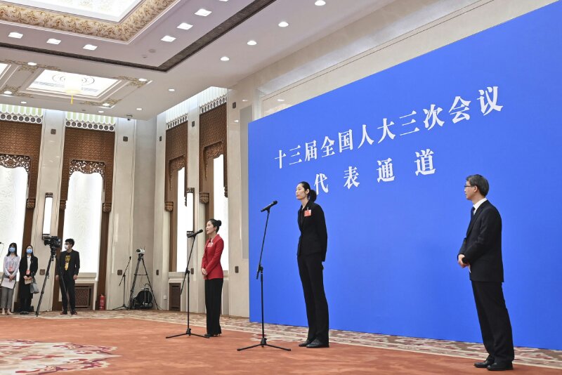 5月22日,第十三屆全國人民代表大會(huì)第三次會(huì)議舉行首場“代表通道”采訪活動(dòng)。這是全國人大代表朱婷(右二)通過網(wǎng)絡(luò)視頻方式接受采訪。新華社記者 劉金海 攝