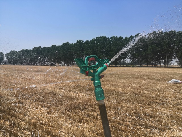去年年初,這片田地里的機(jī)井全部通電了。展元廠覺得現(xiàn)在澆地真的方便多了。他騎著小三輪車把水管、電機(jī)拉到地頭,幾分鐘接好電表、接通電線,擺好滴灌管,嘩嘩的井水隨即就噴灑到田里。“想澆的透一些,就多噴一會兒。電費(fèi)才4毛多錢一度,隨便用也花不了多少錢?!闭乖獜S只需要隔一段時間,挪一挪管子,沒事的時候他甚至可以坐在地頭的樹蔭下休息休息。
