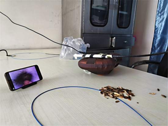 記者看到徐醫(yī)生自制的呼吸內(nèi)鏡,胸部是用一個(gè)家用電動(dòng)按摩枕代替的,用來能模擬人的胸部呼吸起伏;按摩枕上固定了兩個(gè)用打印紙卷成的小紙筒,用來代替氣管;屏幕是用手機(jī)代替的,用WIFI和氣管鏡鏈接,影像可以通過手機(jī)屏幕看到;內(nèi)鏡手柄是徐醫(yī)生用膠泥結(jié)合真實(shí)設(shè)備形狀、重量捏制而成的。當(dāng)著記者的面,徐醫(yī)生把一小半瓜子皮放入模擬人體氣管的紙筒,在手機(jī)屏幕的導(dǎo)航下通過氣管鏡到達(dá)異物所在位置,熟練地用異物鉗夾出異物。