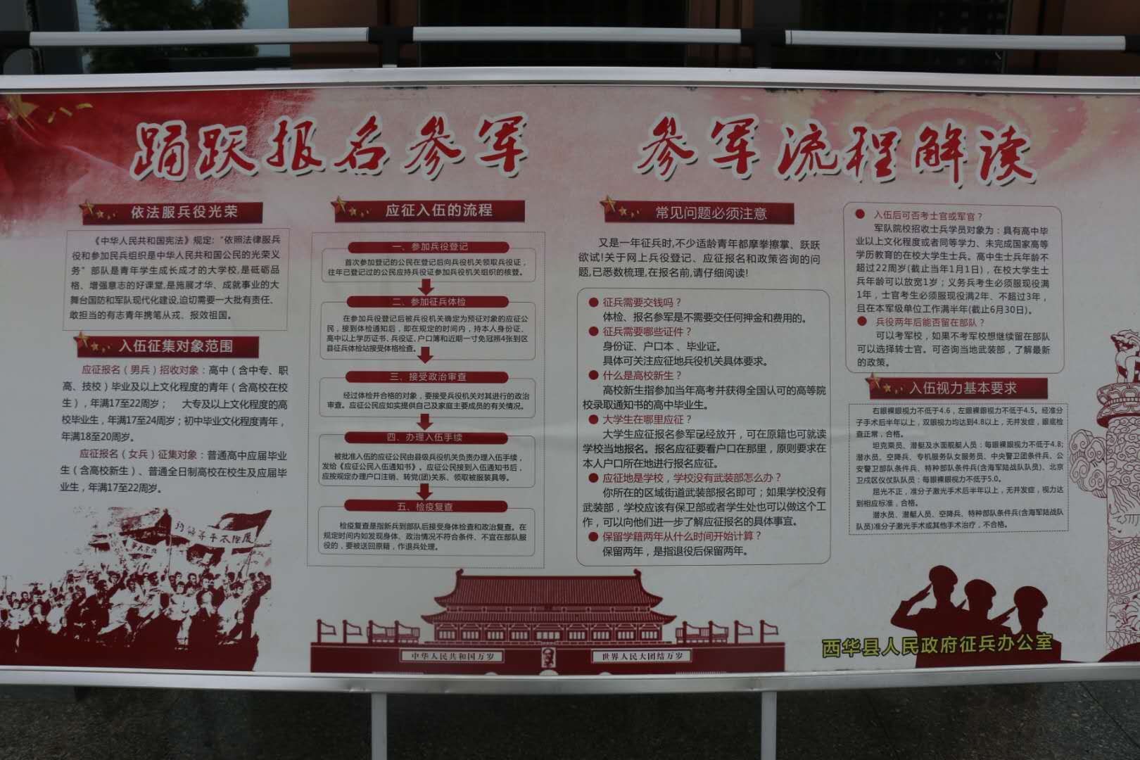 為做好大學(xué)生征兵工作,西華縣人武部認(rèn)真開展了多層次、全方位的宣傳發(fā)動??h人武部多次召開黨委會,分析大學(xué)生征兵形勢,研究制定層層宣傳發(fā)動方案。扎實開展大學(xué)生兵員潛力調(diào)查工作,挖掘大學(xué)生兵員潛力,及時登記造冊。全縣成立了60支由縣人武部干部職工、鄉(xiāng)鎮(zhèn)專武干部、村民兵干部參加的大學(xué)生征兵宣傳小分隊,分頭對轄區(qū)內(nèi)在家的各級各類院校畢業(yè)生和在校生,進(jìn)行挨家挨戶、面對面的宣傳,把《2020年西華縣大學(xué)生征兵宣傳冊》發(fā)放到每一名大學(xué)生手中,做到一人不漏。為其算好“經(jīng)濟(jì)帳”、“ 政治帳”、“ 前途帳”。把針對大學(xué)生青年制定的最新調(diào)整的優(yōu)惠政策宣傳到位,最大限度發(fā)掘大學(xué)生征集潛力。同時,該縣把做深做細(xì)大學(xué)生征兵宣傳報名工作,作為完成征兵任務(wù)的重要基礎(chǔ),積極轉(zhuǎn)變思路,創(chuàng)新工作方法,靈活運(yùn)用各種宣傳手段,千方百計增強(qiáng)宣傳發(fā)動的針對性、實效性。該部除采取散發(fā)傳單、懸掛橫幅、制作板報、張貼標(biāo)語、現(xiàn)場咨詢等傳統(tǒng)方式外,還充分利用廣播、電視、微信、短信、電子屏等傳媒手段增強(qiáng)宣傳效果,做到廣播電視里有音有像,微信短信電子屏有征兵信息滾動發(fā)布,墻報上有文,橫幅標(biāo)語上有宣傳口號,提高全民政治意識和國防觀念,切實讓大學(xué)生入伍優(yōu)惠政策宣傳不留死角。該部充分利用對現(xiàn)役軍人家庭逐戶走訪解難、贈送懸掛“光榮軍屬”牌匾、敲鑼打鼓送喜報等活動,在全社會大力營造“一人參軍、全家光榮”的鮮明導(dǎo)向,讓尊崇軍人的號召在西華縣落地,讓當(dāng)兵光榮的傳統(tǒng)在群眾心中扎根,從而激勵大學(xué)生青年積極報名參軍的報國熱情。