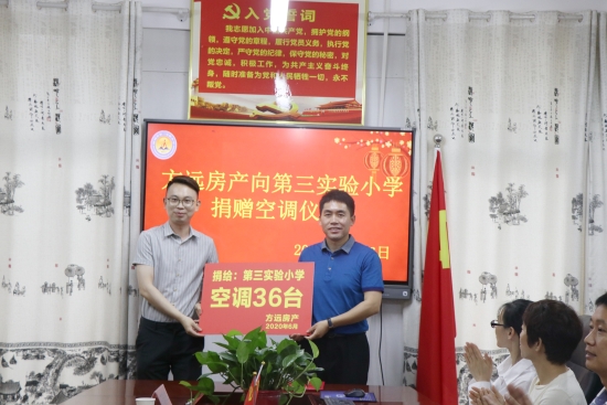 “方遠(yuǎn)房地產(chǎn)公司為第三實(shí)驗(yàn)小學(xué)捐贈(zèng)空調(diào),大大改善學(xué)校的降溫條件,為孩子們營造更為舒適的學(xué)習(xí)環(huán)境?!钡谌龑?shí)驗(yàn)小學(xué)校長王玉剛表示,學(xué)校將以此為契機(jī),號(hào)召廣大學(xué)生好好學(xué)習(xí),長大后回報(bào)社會(huì);全校教職員工以優(yōu)異的教學(xué)業(yè)績回報(bào)社會(huì),傳遞愛心,努力辦學(xué)生快樂、教師幸福、家長滿意的現(xiàn)代化學(xué)校。