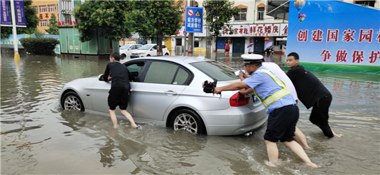 推車、砍樹、疏導(dǎo)……直屬各大隊(duì)民警分赴市區(qū)眾多積水路口路段,或冒雨指揮交通、或徒手清理下水道堵塞物及路面雜物、或在水深過膝路段幫助老人和小孩過馬路。