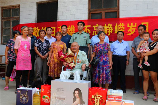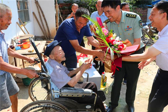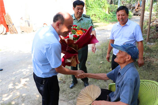 于永前一行來到楊廟鄉(xiāng)大祁行政村時(shí)已近中午,正趕上97歲抗日老戰(zhàn)士吳之太過生日。吳之太老少一家人歡聚一堂,其樂融融??吹轿繂柦M的到來,老人喜極而泣。吳之太老人擦著眼淚說:這些年沒少給黨和政府找麻煩,尤其是縣退役軍人事務(wù)局成立后,幫助他解決了好多困難和問題,并定期來看望他,今天又見到大家,真不知道該說什么好。潘布道代表退役軍人事務(wù)局向老人祝賀生日并告訴老人說:抗戰(zhàn)老戰(zhàn)士是民族的英雄、國家的財(cái)富,為黨的革命和建設(shè)作出了不可磨滅的貢獻(xiàn)。今后,將一如既往地關(guān)心和幫助抗戰(zhàn)老戰(zhàn)士,盡力幫助解決生活中的實(shí)際問題,在全社會形成尊重抗戰(zhàn)老戰(zhàn)士、尊崇抗戰(zhàn)老戰(zhàn)士、關(guān)愛抗戰(zhàn)老戰(zhàn)士的良好氛圍。