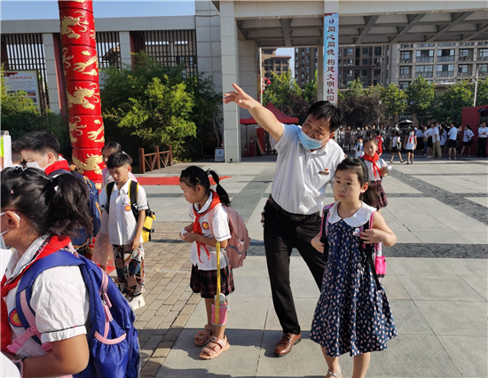 9月7日早上,周口市文昌小學(xué)的學(xué)生有序排隊(duì)測(cè)量體溫后進(jìn)入學(xué)校。據(jù)文昌小學(xué)校長(zhǎng)介紹,全市中小學(xué)實(shí)行錯(cuò)峰開(kāi)學(xué)。今天是小學(xué)開(kāi)學(xué)時(shí)間,文昌小學(xué)學(xué)生每個(gè)年級(jí)實(shí)行錯(cuò)時(shí)上下學(xué),學(xué)生入校要測(cè)體溫,并為一年級(jí)新生舉辦了主題為“夢(mèng)從這里啟航”的“迎新儀式”。