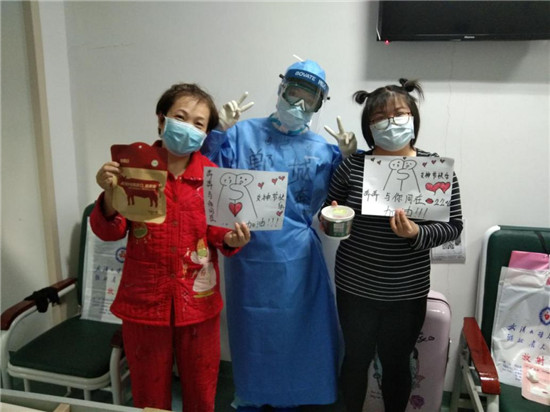 面對新冠肺炎重癥病區(qū)患者心理壓力普遍較大的情況,胡奔奔每天忙完護理工作之余,主動通過談心、跳舞、做游戲等方式對患者進行心理疏導(dǎo),成為大家的“開心果”,使得病區(qū)氛圍大大改善,有了歡聲笑語。三八節(jié)當(dāng)天,她為病區(qū)患者送上親手繪制的“奔奔與你同在”簡筆畫,以及家鄉(xiāng)特產(chǎn)牛肉和胡辣湯,為患者加油。見到患者的笑容,成了胡奔奔最開心的事情。
