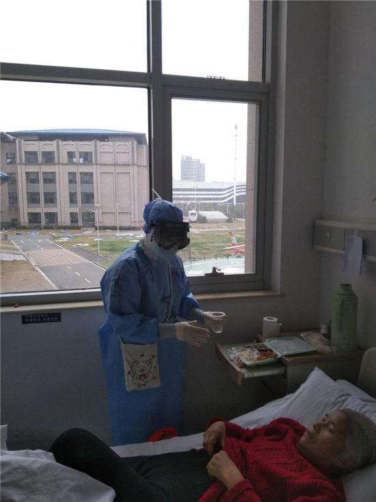 這位老人名叫楊守振,今年84歲,不僅感染新冠肺炎,而且有嚴重的營養(yǎng)不良,插著胃管,身體極為消瘦,生活不能自理。為了不讓老人出現(xiàn)壓瘡,胡奔奔需要每隔一個小時為老人翻一次身。翻身時候,為了讓老人更舒服一點,她每次都像抱孩子一樣把老人抱在懷里,動作輕柔的按摩老人受壓的部位防止壓瘡的形成。貼心照顧之下,老人身體狀況和精神逐漸好轉(zhuǎn),每次跟家人視頻聊天的時候,老人都會指著幫她舉著手機的胡奔奔朝手機里的家人顫顫巍巍的豎起大拇指。