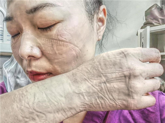因為新冠肺炎的強傳染性,胡奔奔每次去病區(qū)上班都要全副武裝,而且為保證在6個小時的工作時間內(nèi)不被暴露,不能去衛(wèi)生間,不能喝水,還要穿上成人紙尿褲以防萬一。這樣下來,汗?jié)褚路浅J?,而且下班后脫掉防護裝備后,她原本清秀白皙的臉上,滿是深深的皺褶,久久難以恢復(fù),惹人心疼。給家人報平安時,胡奔奔甚至不敢視頻聊天,只能語音安慰家人。