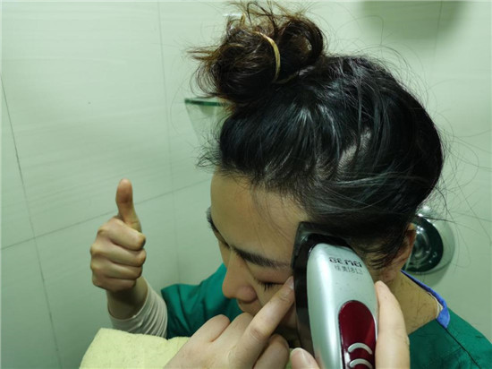 出征武漢之前,為減少感染自己、感染別人的風(fēng)險,出生于1991年、和同齡人一樣愛美的胡奔奔毅然決定同意剃去一襲披肩長發(fā)。這頭秀發(fā),胡奔奔留了多年,曾經(jīng)看得跟生命一樣珍貴,但疫情險惡,她義無反顧。