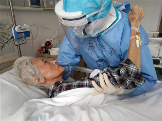 今年74歲的李秀紅,不僅感染新冠肺炎,而且罹患老年癡呆,生活需要時時照顧,而且剛?cè)朐簳r,對陌生環(huán)境的恐懼造成她心情壓抑,天天不說話,時不時落淚。為了讓老人放下心理包袱,胡奔奔在進行哄喂吃飯、服藥等正常護理之余,經(jīng)常陪老人聊天、唱歌,后來老人情緒明顯好轉(zhuǎn),還主動與胡奔奔一起扭起了舞蹈。后來,老人康復(fù)出院時,雖然無言 卻一直緊緊抓著胡奔奔的手久久不愿放開。胡奔奔說,那一刻,她落淚了,但心里確實說不出的高興。