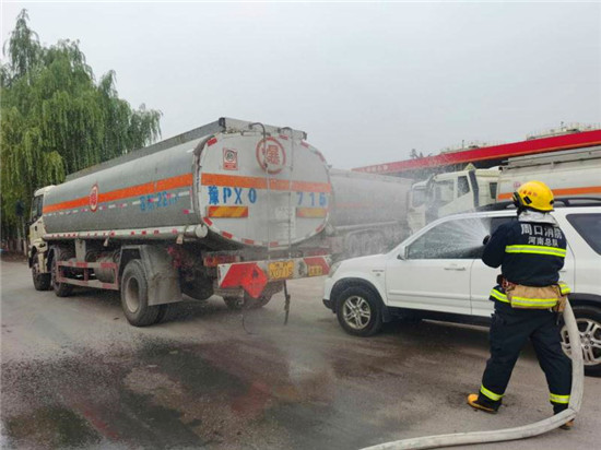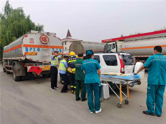 當(dāng)日上午10時(shí),商水交警大隊(duì)指揮中心接到報(bào)警:在商水縣興商大道與陳勝大道交叉口西、湯莊油庫(kù)處,一輛轎車(chē)與一輛?;饭捃?chē)追尾相撞,正常罐體損壞,?;沸孤镀鸹?,轎車(chē)駕駛室變形,駕駛?cè)吮焕к?chē)內(nèi),如不及時(shí)救援,駕駛?cè)擞猩kU(xiǎn),另外因事故現(xiàn)場(chǎng)臨近湯莊油庫(kù),如不及時(shí)處置可能發(fā)生爆炸,后果不堪設(shè)想。