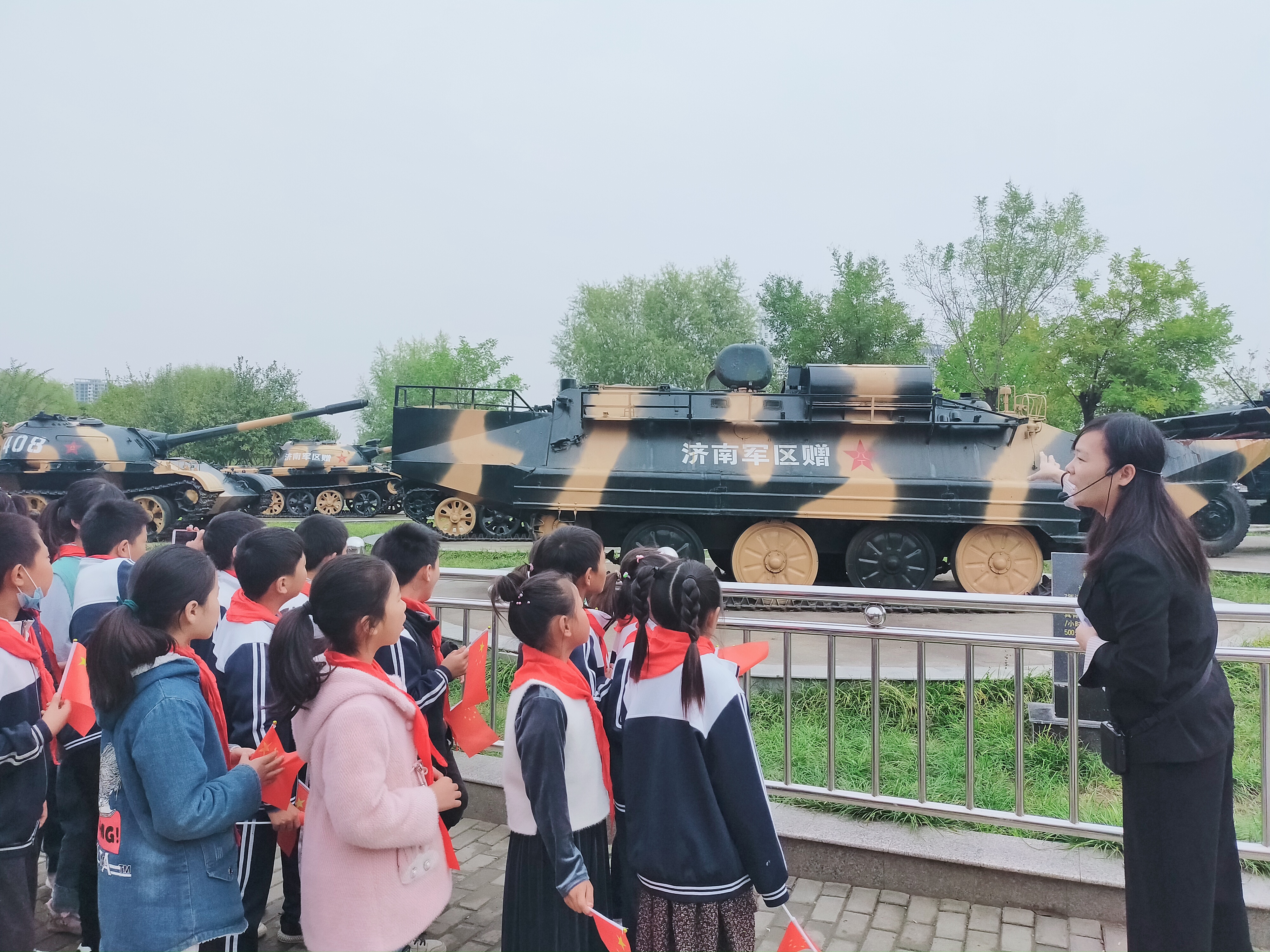 當日10時許,在講解員的帶領(lǐng)下,學(xué)生們在周口國防園參觀了坦克、火箭炮、榴彈炮、高射炮、飛機等軍事裝備,增長了國防知識,受到了愛國主義教育。隨后,在主辦方志愿者的帶領(lǐng)下,學(xué)生們在軍艦旁齊唱國歌共同慶祝祖國生日。