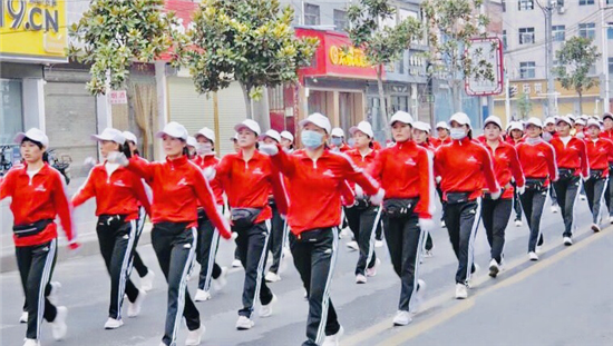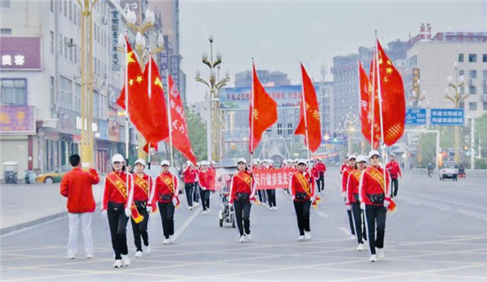 10月11日早晨,鄲城大街上迎來了一道靚麗的風景線——他們身著鮮艷的紅色運動服,肩扛五星紅旗,手扯橫幅,隨著動感十足的音樂,昂首闊步徜徉在金色的秋天里……