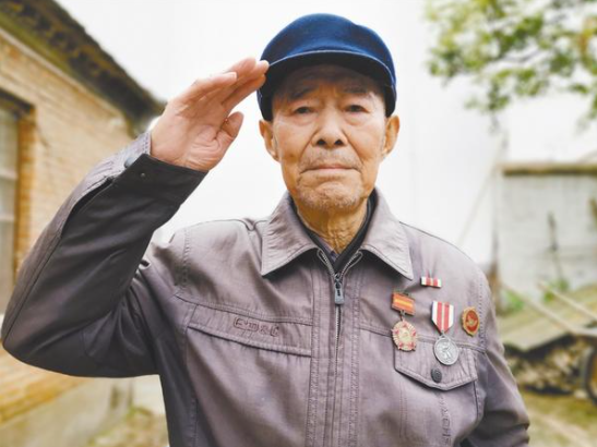 聽說記者要為他照相,老人立即要求家人為他換身干凈的衣服,認(rèn)真把軍功章、獎?wù)乱灰淮髟谏砩?,雙腿合攏,努力地挺直上身,對著鏡頭打了一個標(biāo)準(zhǔn)的敬禮(如圖)。