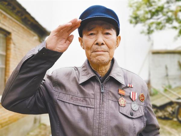 聽(tīng)說(shuō)記者要為他照相,老人立即要求家人為他換身干凈的衣服,很認(rèn)真地把軍功章、獎(jiǎng)?wù)乱灰淮髟谏砩?,雙腿合攏,努力地挺直上身,對(duì)著鏡頭打了一個(gè)標(biāo)準(zhǔn)的敬禮。