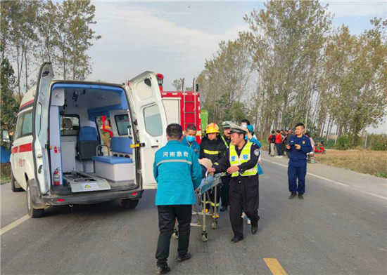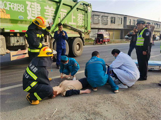 周口市商水縣公安局交警大隊(duì)為提高民警處置國、省道市縣結(jié)合部路段道路交通事故應(yīng)急救援能力,第一時(shí)間救助受傷人員,最大限度將交通事故造成的人員傷亡、財(cái)產(chǎn)損失、環(huán)境污染等危害后果降低到最小限度。10月26日下午3時(shí),在周口市交警支隊(duì)事故科王領(lǐng)科長的協(xié)調(diào)指揮下,商水縣公安局交警大隊(duì)聯(lián)合駐馬店市上蔡縣公安局交警大隊(duì),在223省道(原219省道)商水縣與上蔡縣交界處的上蔡縣華陂鎮(zhèn)賴莊路段,模擬大貨車與微型貨車發(fā)生事故現(xiàn)場,演練省道市際突發(fā)道路交通事故應(yīng)急救援行動。