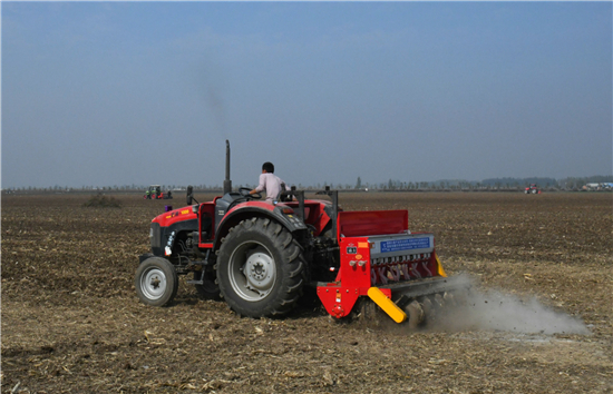 10月28日,在商水縣高標準農(nóng)田內(nèi),一臺免耕播種機在播種小麥。