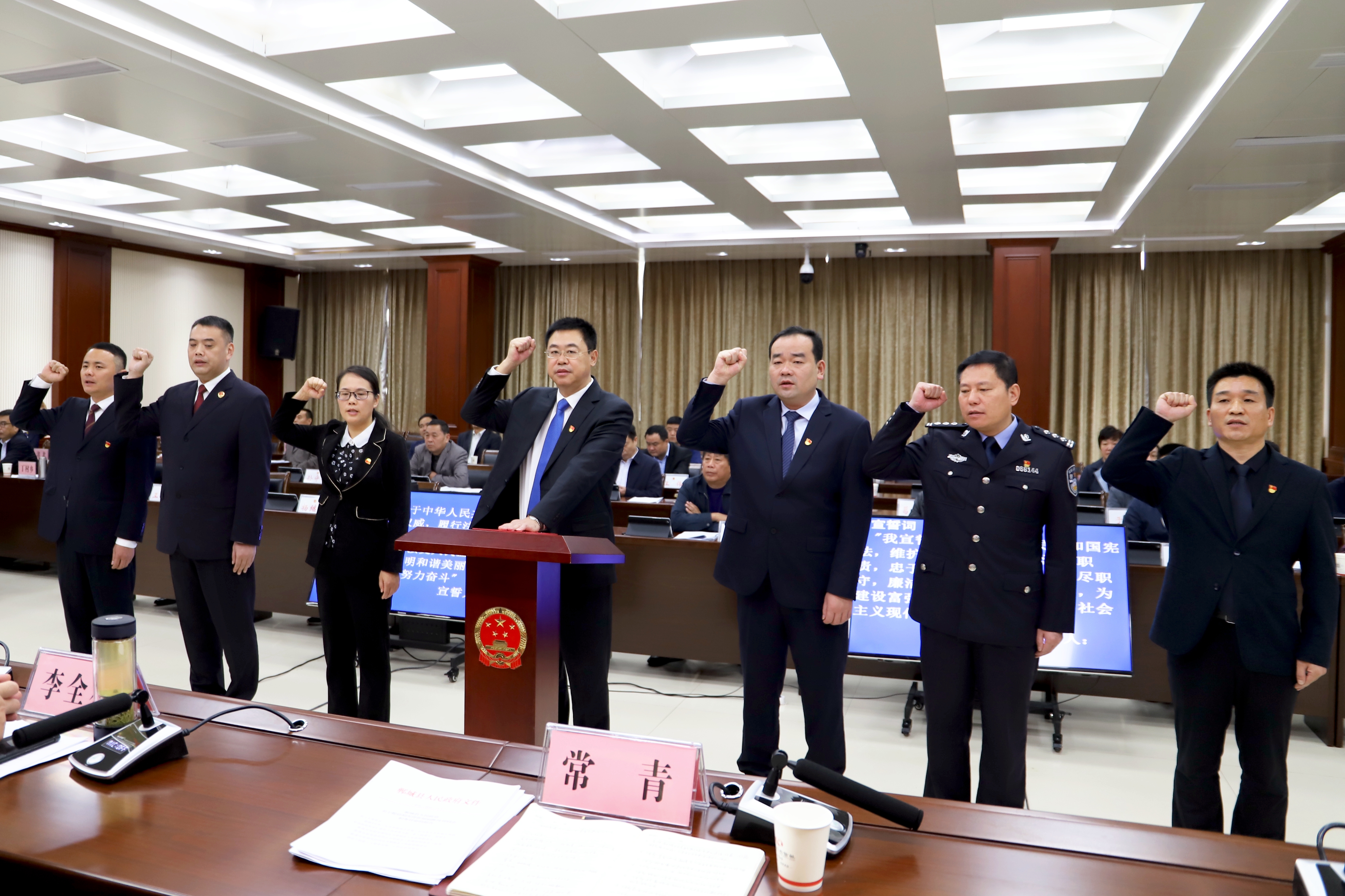 李建軍向新任命同志頒發(fā)任命書;在縣人大常委會組成人員監(jiān)誓下,新任命的同志由常青領(lǐng)誓向憲法進(jìn)行了宣誓。