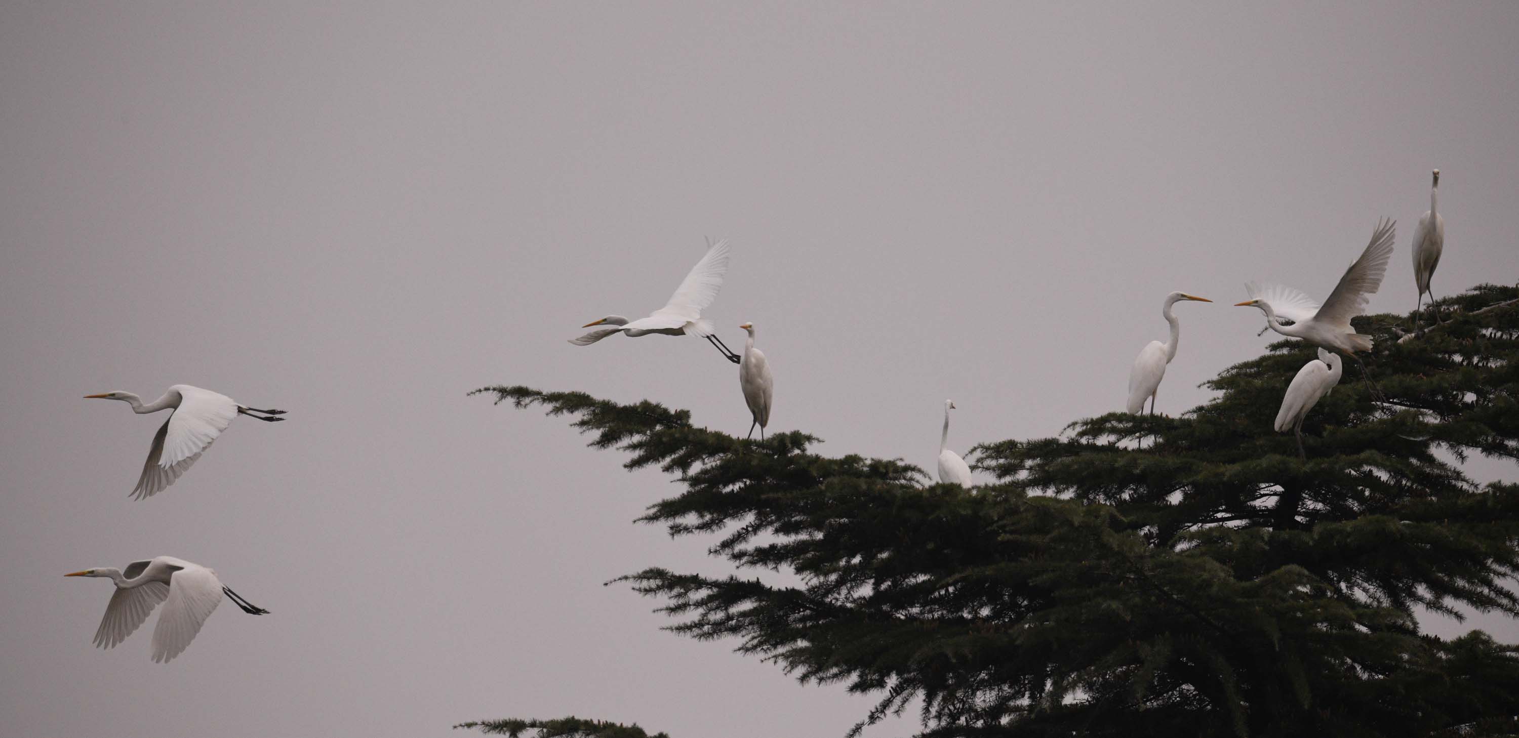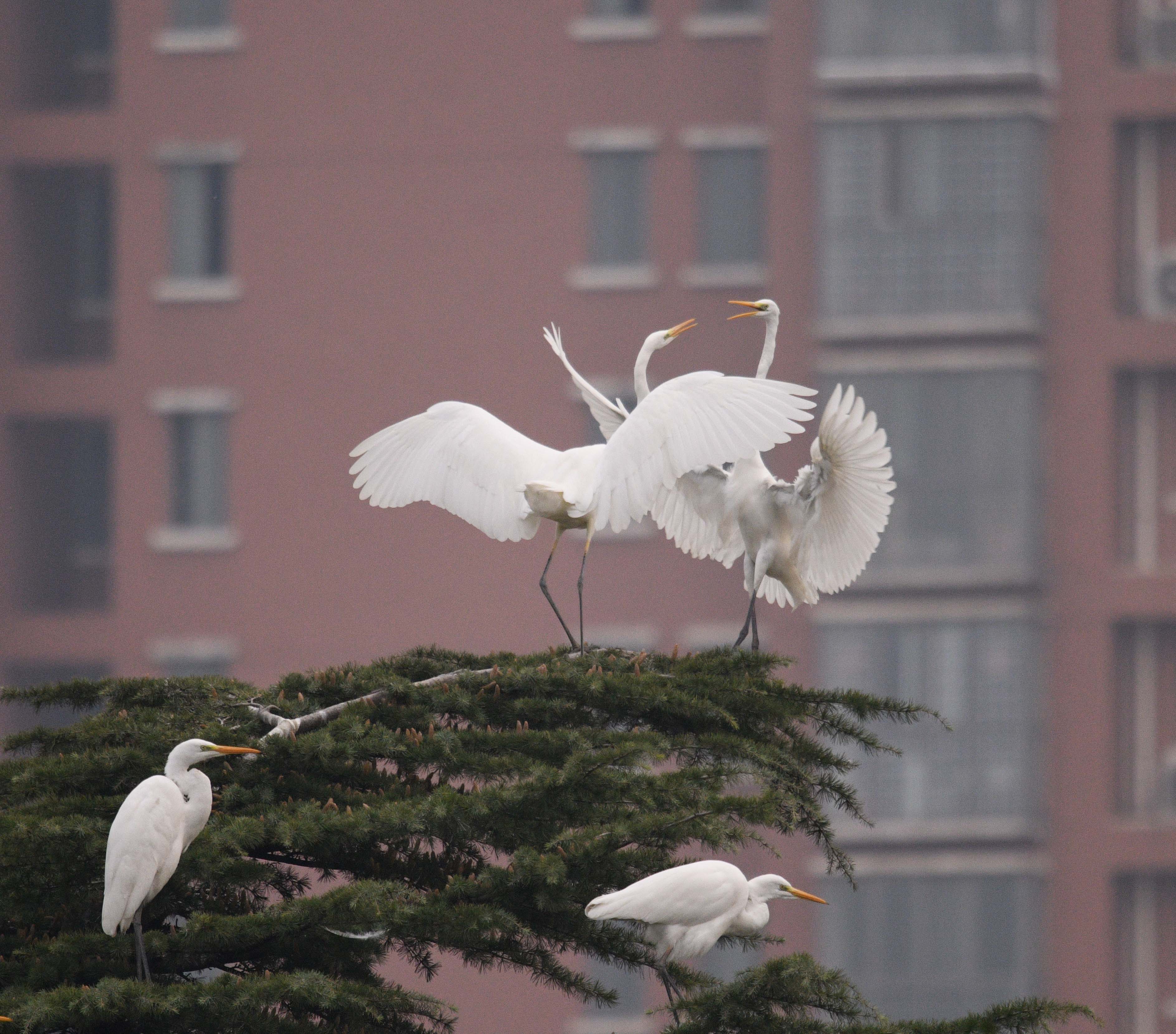 近日,市區(qū)漢陽路沙潁河大閘的中心島林間,飛來近百只白鷺。這里幽靜舒適的環(huán)境和河里豐富的魚蝦,滿足它們棲息和生活。它們面對行人,不驚不詫,時而盤旋嬉戲,時而捉魚果腹。人鳥和諧相處,構(gòu)成美麗的生態(tài)風情。②9