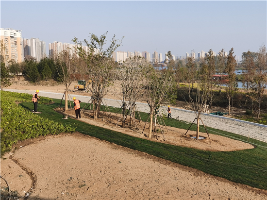 11月11日,在中心城區(qū)沙潁河北岸周口大道至八一大道段生態(tài)改造工程EPC項(xiàng)目施工現(xiàn)場(chǎng),施工人員正在進(jìn)行地被植物的種植、綠化樹(shù)木的養(yǎng)護(hù)。
