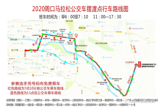此外, 記者還從大賽組委會獲悉,2020周口馬拉松比賽公交車擺渡點行車路線圖也已公布,參賽選手憑號碼布可以免費乘車,去時乘車路線為:文明路口——工農(nóng)路口——大慶路停車點——慶豐街——景園停車點——奧蘭停車點——公務(wù)員A區(qū)停車點——建業(yè)北門停車點周口大道——碧桂園停車點——堤頂北路——武盛大道——引黃調(diào)蓄風(fēng)景區(qū)門口擺渡車乘車起點;回來時路線為:引黃調(diào)蓄風(fēng)景區(qū)——武盛大道——堤頂北路——碧桂園停車點——周口大道——慶豐街——建業(yè)北門停車點——公務(wù)員A區(qū)停車點——奧蘭停車點——景園停車點——大慶路停車點——七一路,其中班車運行時間為早6:00至7:10,11:00至17:30。因場地受限,活動當(dāng)天的停車區(qū)域分為兩處,一是引黃調(diào)蓄風(fēng)景區(qū)西門南北兩側(cè)便道;二是風(fēng)景區(qū)西門向南路西600米處東西無名路。