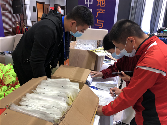 11月12日上午,記者在位于八一大道與文昌大道交叉口的佳利地產(chǎn)營銷中心門口看到,今年由于疫情管控的需要,參賽選手領(lǐng)取裝備前需要先展示自己的健康碼,并配合醫(yī)護人員測量體溫,進入現(xiàn)場還需戴口罩。在一樓活動大廳,來自周口馬拉松協(xié)會的志愿者們先為選手確認身份信息,再根據(jù)選手的身材、體型為其發(fā)放含有不同型號運動衣的背包。最終,每個參賽選手都會領(lǐng)到一個熒光綠色的小背包,里面裝有號碼布、參賽長袖T恤、存衣包、手套、一次性風(fēng)雨衣和一本官方手冊等。