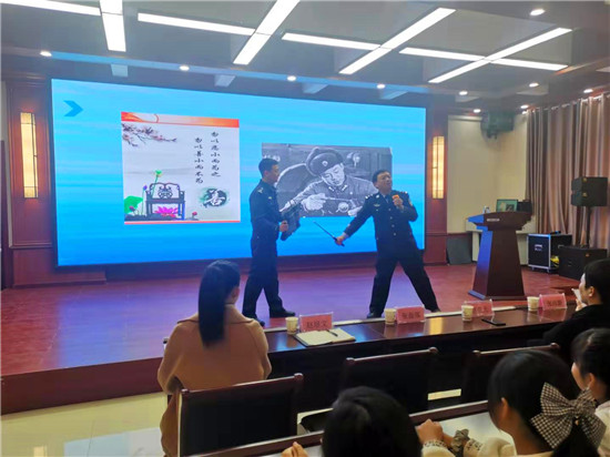 課堂上, 公安民警用鮮活的案例剖析青少年違法犯罪的心理軌跡,讓同學(xué)們做遵紀(jì)守法好學(xué)生。民警們解讀了社會主義核心價值觀基本內(nèi)涵和具體要求,教育同學(xué)們要愛黨愛國愛校園愛學(xué)習(xí),做人誠信,做事友善。民警們還教會學(xué)生們?nèi)绾巫R別毒品,認(rèn)識毒品危害,做到拒絕、遠(yuǎn)離毒品,爭當(dāng)禁毒小小宣傳員。對如何防范被刀棍傷害,民警們演示了書包板凳防護(hù)法。③5