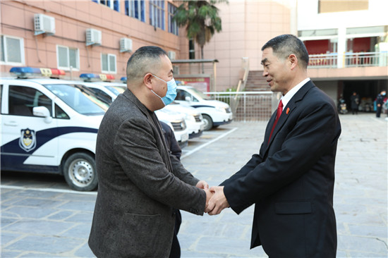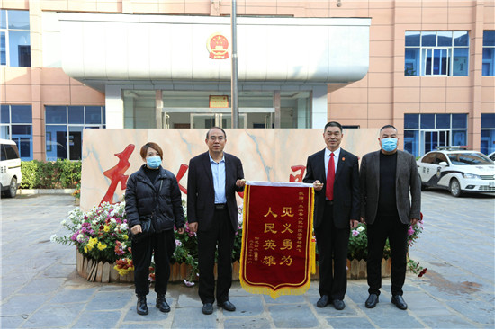 11月19日,侯某某夫婦將一面寫有“見(jiàn)義勇為 人民英雄”的錦旗送到太康縣人民法院法官楊鵬飛手中,表達(dá)一家人對(duì)楊鵬飛救助落水女兒的感激之情。