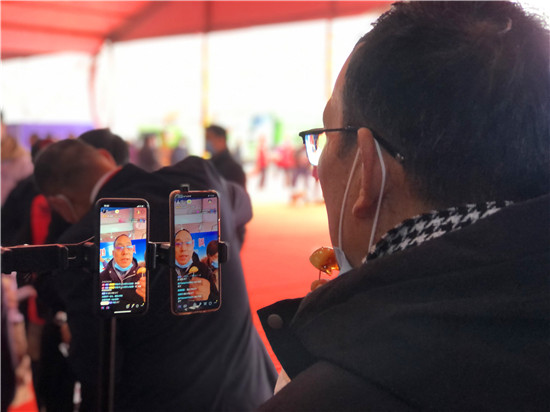 28日早上7時(shí)許,周口網(wǎng)紅俱樂部的網(wǎng)紅們和工作人員就開始為今天的直播做準(zhǔn)備,早早把直播設(shè)備搬到現(xiàn)場,進(jìn)行調(diào)試。10時(shí)左右,周商產(chǎn)品展示展覽活動(dòng)現(xiàn)場人頭攢動(dòng),熱鬧非凡,來自周口本地的9位網(wǎng)紅們陸續(xù)架好手機(jī)直播設(shè)備,打開補(bǔ)光燈,開始直播。現(xiàn)場的9位網(wǎng)紅各有特色,有打扮時(shí)髦的美女主播,有歌聲出眾的中年大叔,年齡最大的網(wǎng)紅是今年65歲的鹿邑大爺。網(wǎng)紅們一手拿著周口的蜂蜜、空心掛面、麻花、粉條、醬豆等土特產(chǎn),一邊對(duì)著手機(jī)屏幕里的粉絲熱情地展示和介紹起來,有的還直接進(jìn)行現(xiàn)場吃播,不時(shí)與網(wǎng)友進(jìn)行唱歌、聊天互動(dòng),吸引了不少行人前來觀看?!霸瓉碓诙兑羯峡催^網(wǎng)紅帶貨,但沒見過真人, 今天終于見到真實(shí)的網(wǎng)紅了!感覺很有意思!”前來觀展的市民劉女士說。