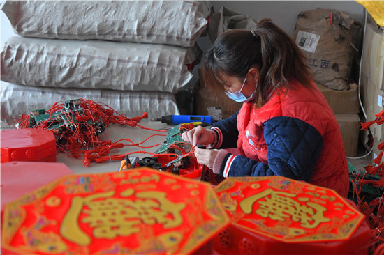 12月14日,記者在一帆工藝制作工廠內(nèi)看到,二十多名村民在各自的工作崗位上有條不紊地忙碌著。簡(jiǎn)易焊接、測(cè)試組裝、安裝炮串……一串串喜慶的電子鞭炮組成裝箱,賀潘海正在指揮工作人員裝車,現(xiàn)場(chǎng)一派繁忙的景象。
